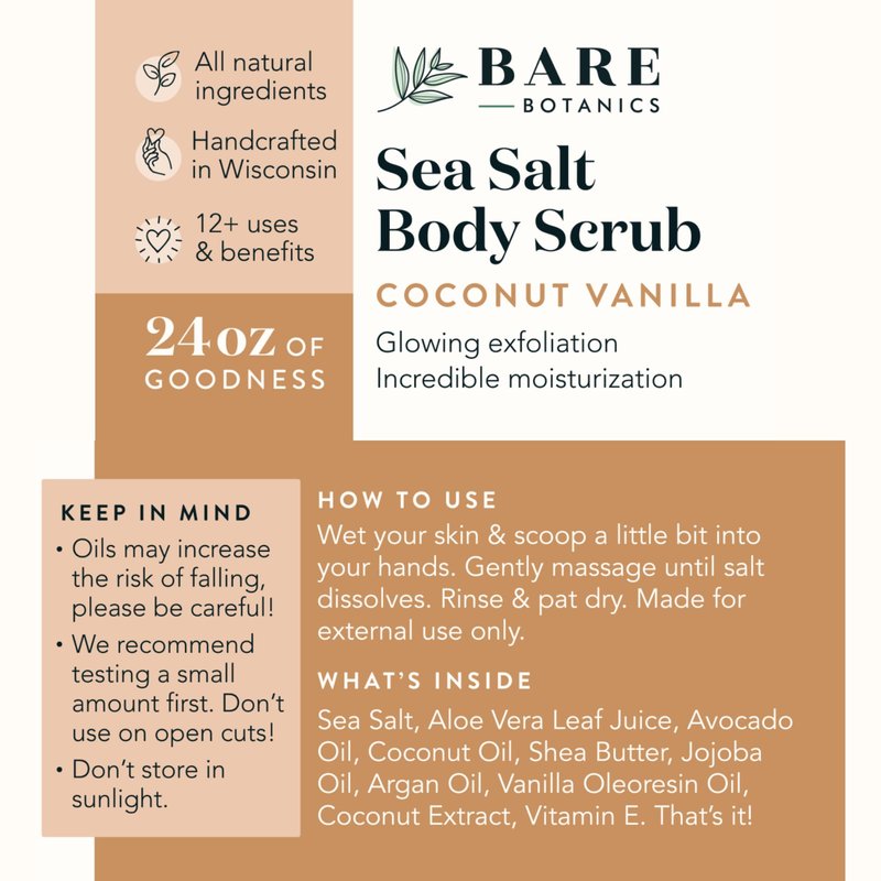 Bare Botanics Coconut Vanilla Body Scrub 24oz | Made in Madison, WI | All Natural Sea Salt Exfoliator w/ Skin Loving Moisturizers | Vegan & Cruelty Free | Gift Ready Packaging w/ a Cute Wooden Spoon