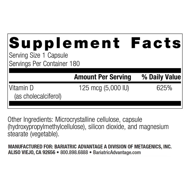 Bariatric Advantage Vitamin D Capsules 5,000 IU are expertly crafted to combat the common deficiency seen in both pre- and post-surgery bariatric patients.* This supplement delivers a high-potency dose of vitamin D3. * Each capsule provides 5,000 IU of cholecalciferol, supporting a healthy level of this essential nutrient.*The unique water-miscible design of our vitamin D supplements aids proper absorption, even in patients with impaired fat absorption due to bariatric surgery.* Our 'dry' vitamin D, packaged in small, easy-to-swallow capsules, is a practical solution for those with reduced fat intake or absorption issues.*Recognizing the widespread incidence of vitamin D deficiency following bariatric surgery, Bariatric Advantage has created a supplement that aids in preventing this deficiency. Furthermore, our capsules support calcium and phosphorus absorption, crucial components for bone growth and remodeling.*Take one capsule daily or as directed by your healthcare practitioner.Bariatric Advantage nutritional supplements and products are scientifically formulated to meet the specialized nutritional recommendations for patients who have undergone bariatric surgery or are following a medically supervised program. We believe that through quality and adherence to scientific principles, we can help support a vision of life-long health for bariatric patients.