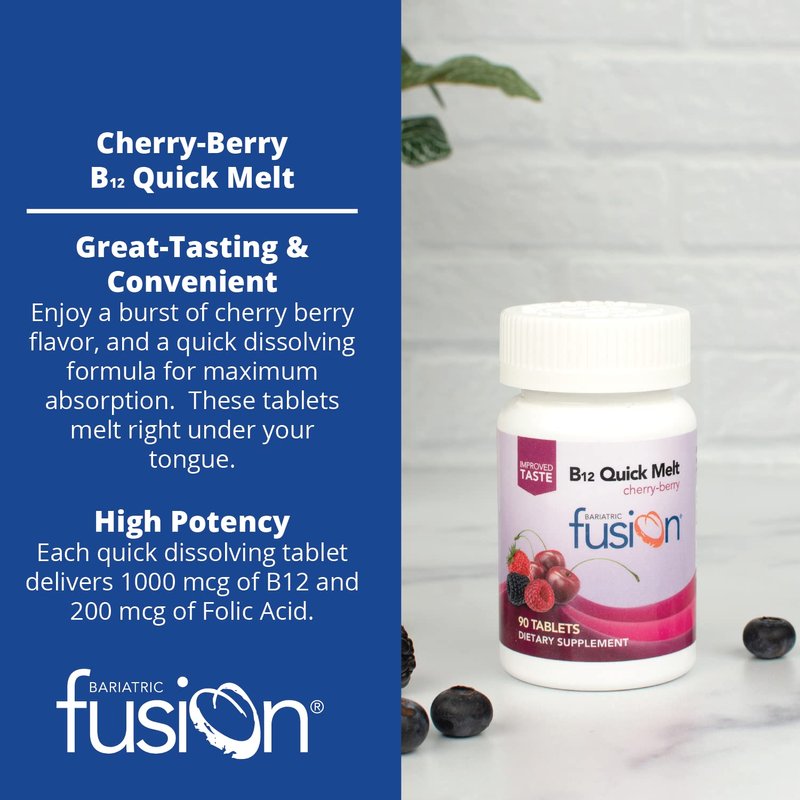 Bariatric Fusion Vitamin B12 Melt | Cherry Berry Flavored Tablets | Dissolves On Your Tongue B 12 Vitamin 1000 mcg and Folic Acid | Vegan B12 Vitamins | Gluten, Dairy & Soy Free | 90 Count