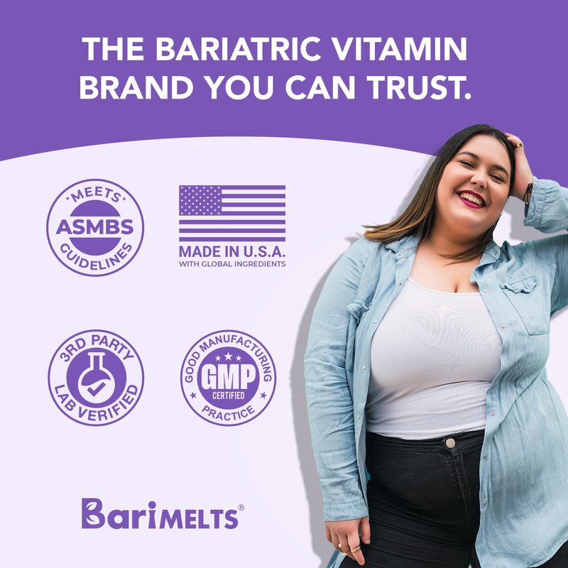 - Committed to quality and efficacy: BariMelts vitamins meet ASMBS guidelines, are produced in our NSF-certified GMP facility, and undergo third-party testing for potency and purity so you can complete your daily ritual with confidence
