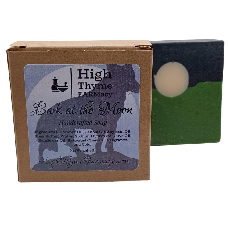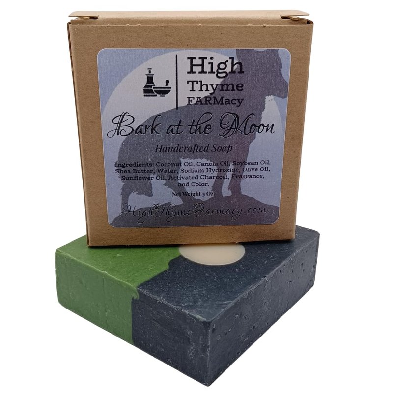 Introducing High Thyme FARMacy's Bark at the Moon Men Soap with Activated Charcoal, a cleansing experience inspired by the iconic Ozzy song. Living in a lunar spell, he'll find his heaven with Bark at the Moon soap. Our soap is made with sustainably sourced ingredients and activated charcoal for a deep pore cleanse. Bark at the Moon bars of soap feature a complex blend of sweet citrus and amber, This shea butter soap is an amazing way to keep your skin looking and feeling its best. The captivating aroma from this organic bar soap will uplift your senses and provide a moment of tranquility in your daily routine. Crafted with care and expertise, this handcrafted black soap bar combines the nourishing properties of activated charcoal with a blend of natural ingredients. Activated charcoal gently detoxifies your skin, drawing out impurities and leaving you with a refreshed and revitalized feeling. Immerse yourself in the luxurious lather as the Bark at the Moon Soap envelops your skin, leaving behind a subtle fragrance that lingers throughout the day. Pamper yourself with this unique creation. A perfect men's bar soap, Bark at the Moon Soap is sure to please. Experience its luxurious aroma and detoxifying properties today! Bark at the Moon Soap is a luxurious indulgence that your skin will thank you for. The cleansing action of activated charcoal in this mens body soap helps to pull toxins from your pores, making it ideal for combination or oily skin types. The addition of natural oils and butters deeply nourish the skin, providing long-lasting hydration. The intoxicating aroma of frankincense and myrrh adds a touch of mystery to this gentle cleanser. With its earthy, smoky scent, Bark at the Moon Soap is sure to leave you feeling invigorated and refreshed after every use. Give your skin the care it deserves and add Bark at the Moon Soap to your daily routine. Experience its invigorating aroma and amazing detoxifying benefits today!