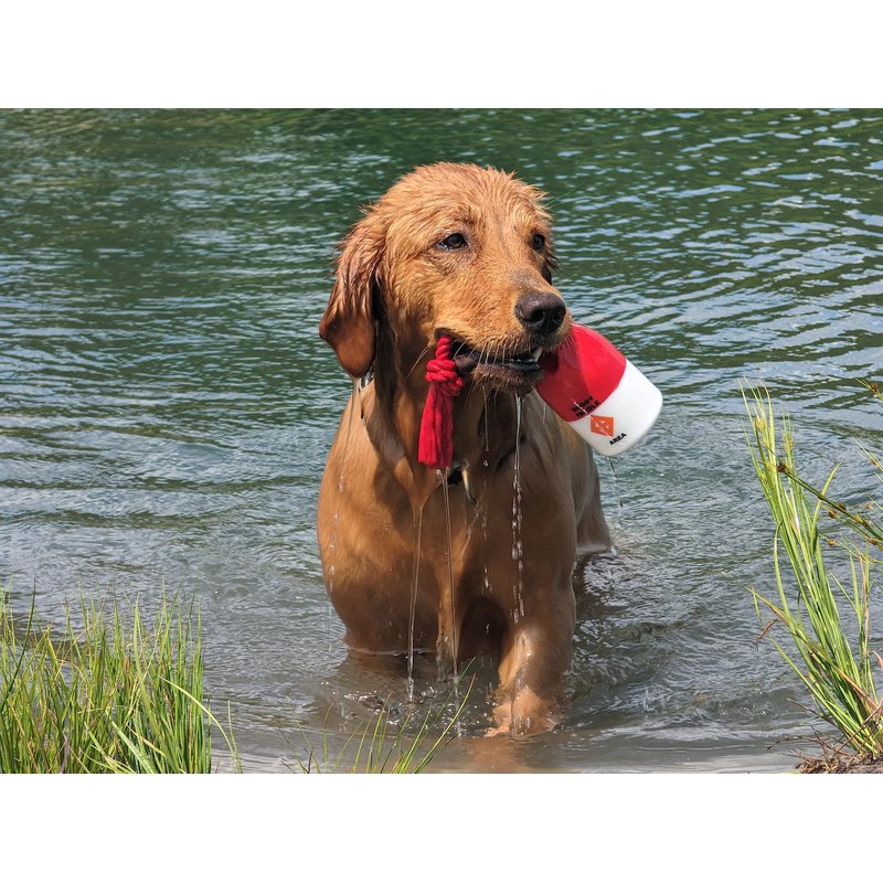 • The compact size with rope makes it easy to throw and retrieve. Buoy toy measures 5 inches tall with a 2.75-inch diameter. The thermoplastic rubber dries quickly making it easy to transport and store.