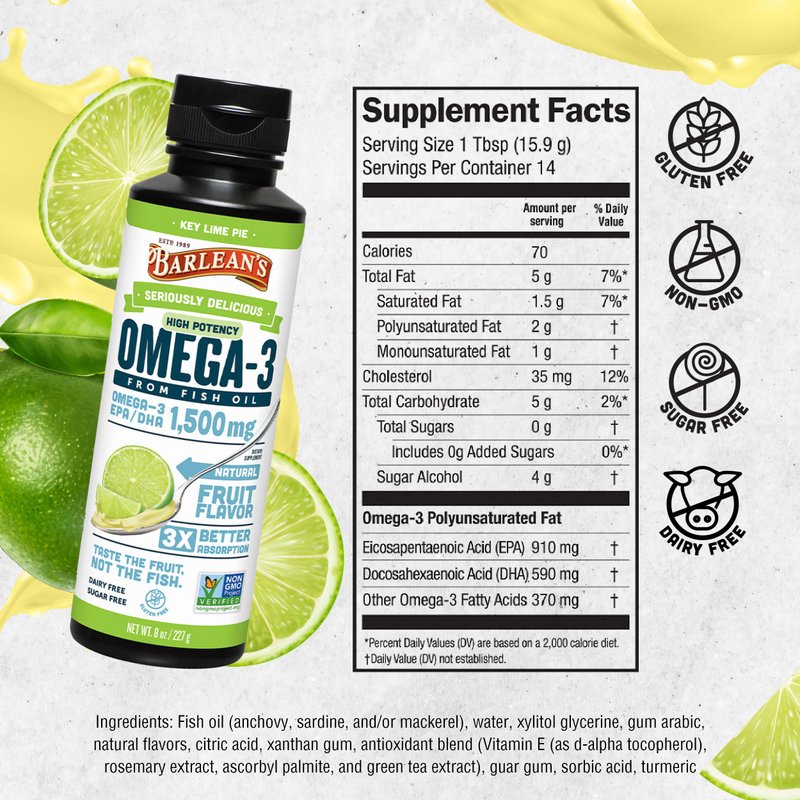 Barlean's Key Lime Pie High Potency Omega 3 Fish Oil Liquid Supplement, 1500mg of EPA& DHA Fatty Acid, Smoothie Flavored & Burpless for Brain, Joint, & Heart Health, 8 oz