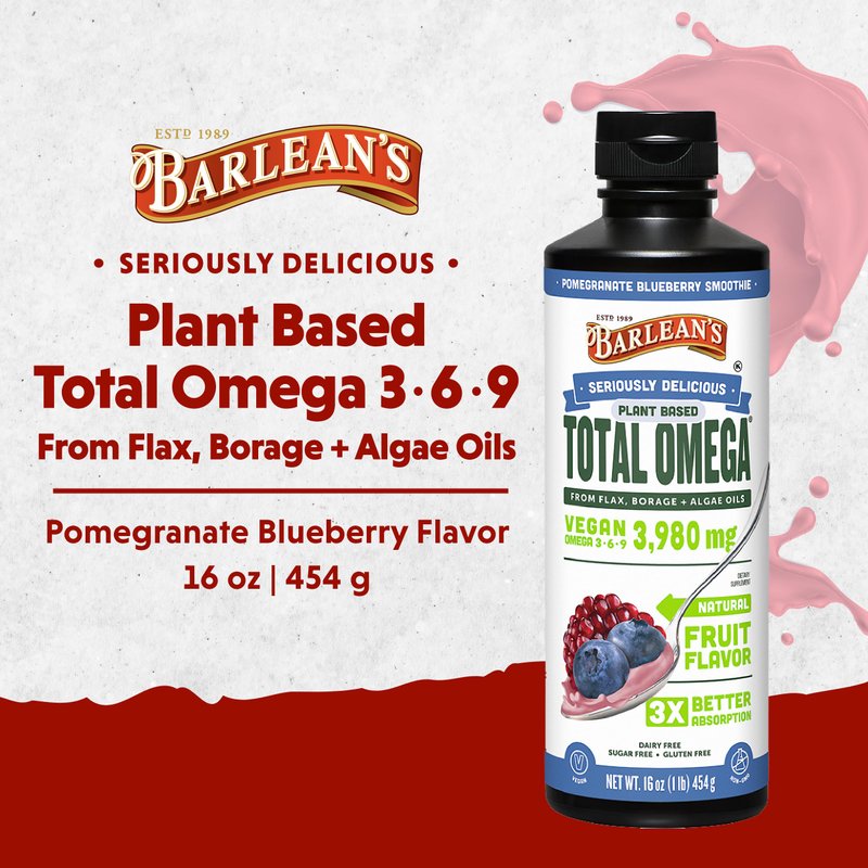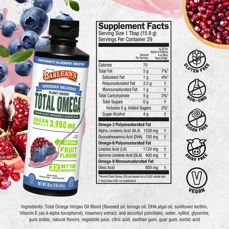 Barlean's Liquid Flaxseed, Borage & Algae Oils Omega 3 Supplement, Pomegranate Blueberry Flavor, Vegan EPA & DHA from Algal Oil, Flax Oil and Borage Seed Oil with 3,980 mg of Omega-3-6-9, 16 oz