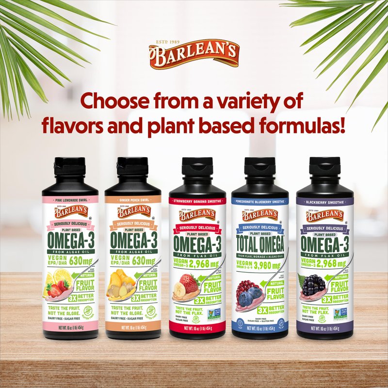 - TASTE THE FRUIT NOT THE FLAX: Yummy fruity flavored vegan Omega 3 oil with a creamy smoothie texture that both kids and adults love is the secret behind Barlean's Total Omega oil liquid. Omega 3 oil features all the Omega 3, 6 and 9 fatty acids our brains and bodies need, and does not contain artificial flavors, colors or sweeteners plus dairy-free, sugar-free and non-GMO