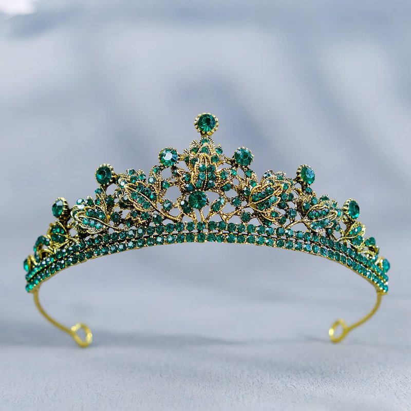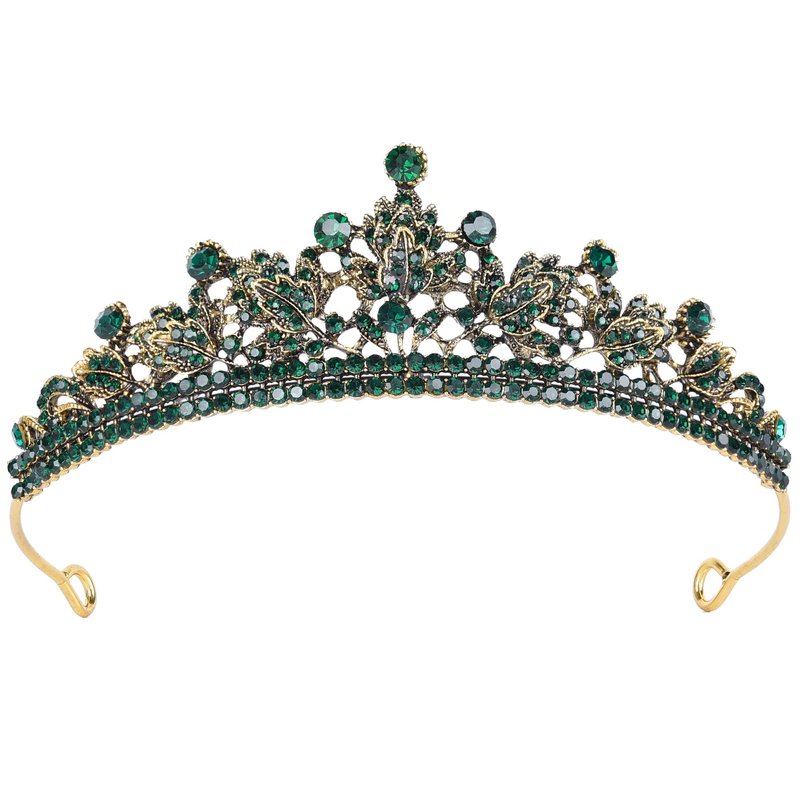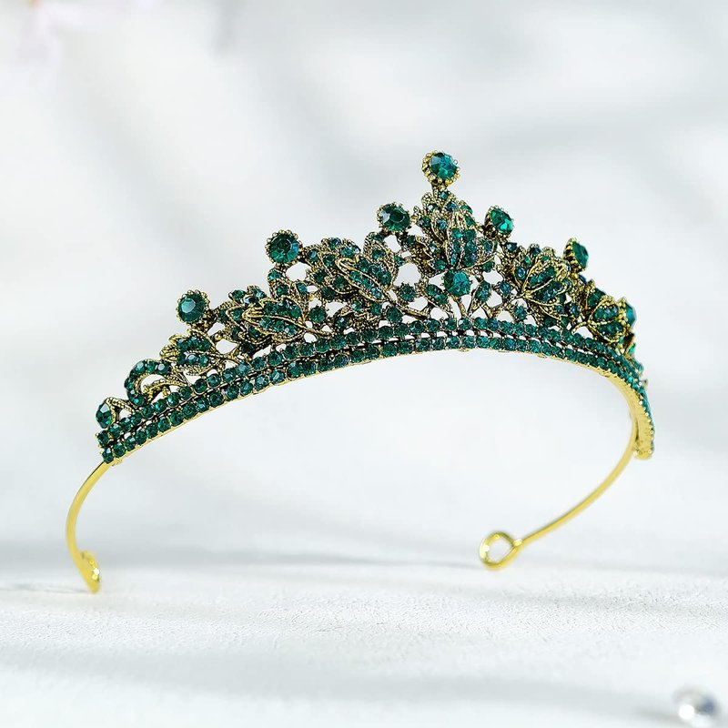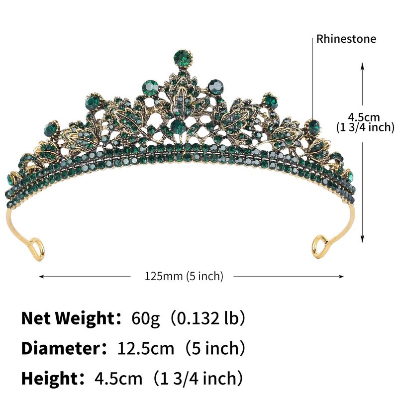 - Material: Rhinestone wedding crown and tiara is made of alloy, green rhinestones and crystals. Vintage Gold color and baroque style for women