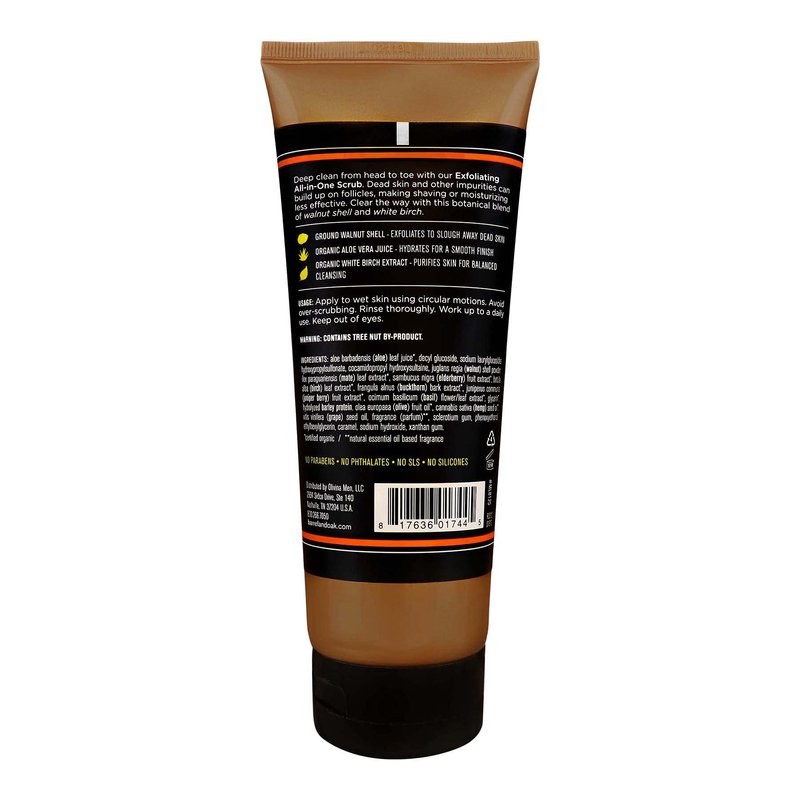At Barrel and Oak, we formulate grooming essentials that are made to be everyday classics. We offer a full spectrum of grooming and body products with simple, time-honored, and premium ingredients because we think our bodies deserve more. And it all began with organic olive oil, hence the name of our collection. With a focus on function, fragrance, and effective ingredients, our goal has been to create products for the modern man: one who is health-conscious and practical. The inspiration behind our natural fragrances is blending the earthy aroma of the outdoors paired with sophisticated notes of various essential oils. It’s time to start smelling like the man you want to be. Our exfoliating scrub comes in Barrel and Oak's signature fragrance, Bourbon Cedar. Inspired by the wood-aging tradition of American distilleries, as Bourbon Cedar matures, a highly spirited top note makes way for a rich red cedar and smoky vanilla finish. Fragranced with sweet notes of lemon and lavender accompanied by earthy tones of cedarwood and bourbon accord—it smells amazing! Our all-in-one exfoliating scrubs for men are more subtle than their synthetic counterparts, but they're better for you and the planet. Unlike other face and body scrubs, our exfoliators use a botanical blend of walnut shell and white birch—both are natural exfoliators that are a great alternative to harmful plastic microbeads that damage marine life. Barrel and Oak's exfoliating scrub deep cleans from head to toe. Proper exfoliation removes dead skin and other impurities that can cause build-up on follicles. Clear the way for more effective shaving and moisturizing. Apply to wet skin using a circular motion to deep clean your body from head to toe—then rinse thoroughly. Clear the way with Barrel and Oak’s Exfoliating All-In-One Scrub and make your skin look fresh and healthy. Earth-friendly, you-friendly, and wallet-friendly! (CONTAINS TREE NUT BY-PRODUCT)