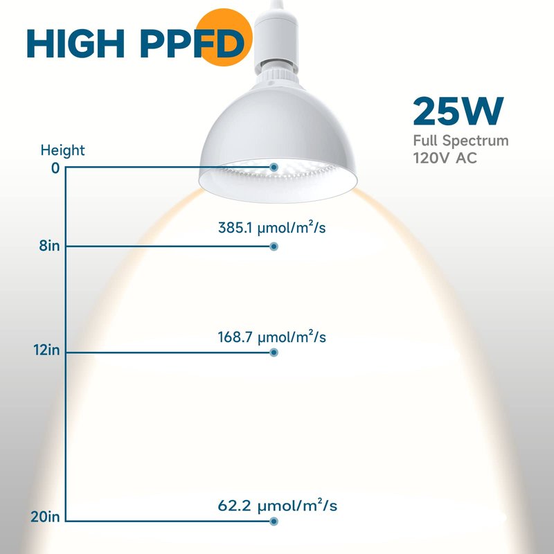 - High PPFD: This plant light bulb contains 120 pieces of 0.5-watt LED chips, which provide a high PPFD (Photosynthetic Photon Flux Density) of 385μmol/s/m² and produce 3000lm of brightness at a height of 8 inches. Compared to traditional 150W growing lights, this grow light consumes only 25W of energy, making it a more scientifically advanced and energy-efficient option