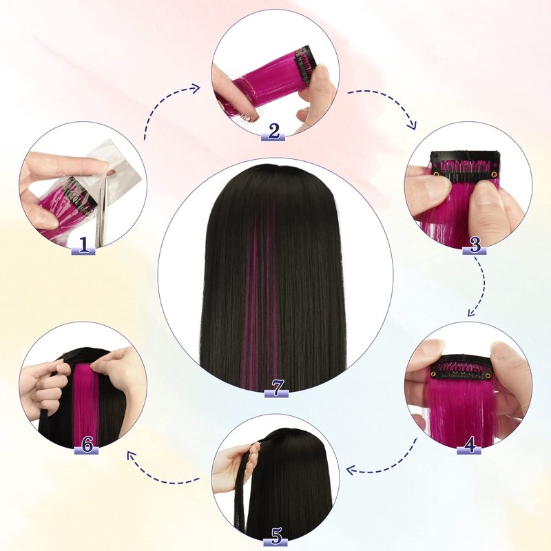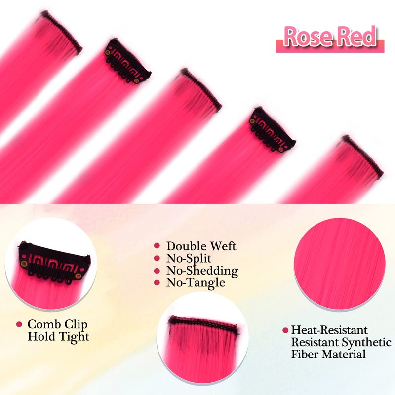 - 【Colored Hair Extensions】12 PCs set hot pink colored clip-in straight hair extensions, each single piece has a small clip on the end that make the wearing sooo Easy & Sturdy. Comes with a pack of small colorful leather bands to create more fun hairstyles!