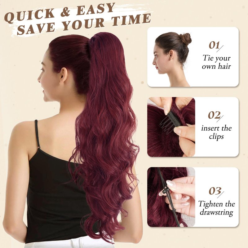 - 【Time-Saver & Beginner Friendly】In just a few seconds, you can transform your look with this amazing hair extension! All you have to do is put your hair into a bun, insert the clips, and tighten the elastic drawstring. You'll instantly have an attractive wavy ponytail.