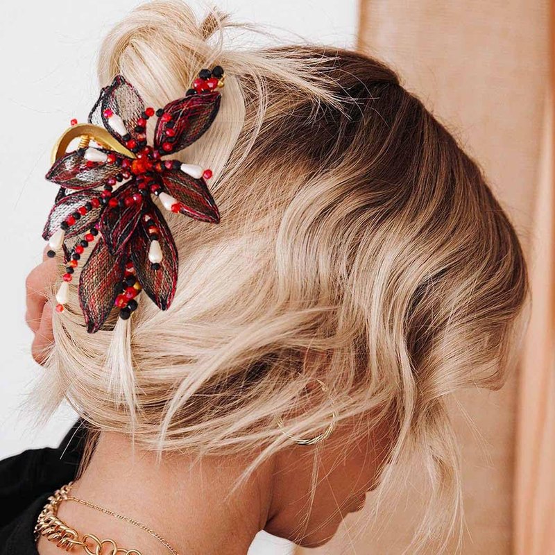 BARTOSI Flower Hair Claw Clips Gold Handmade Copper Wire Floral Hair Clip Rhinestone Beaded Claw Clips Thick Hair Hair Accessories for Women Package include: 1 pieces handmade copper wire claw clips for thick hair Color: gold & red & black Size: Length 11.3CM/4.4IN, height 4.5CM/1.8IN Material : good quality copper wire, rhinestone beaded and metal alloy Applications: This flower claw clips for thick hair can be worn for any occasion, whether you are attending a party, wedding, birthday party or daily wear, make you look more unique and charming. Also makes a great gift for wife, mother, bestie, dance partner and friends.