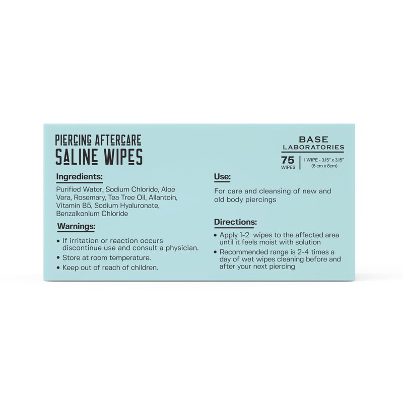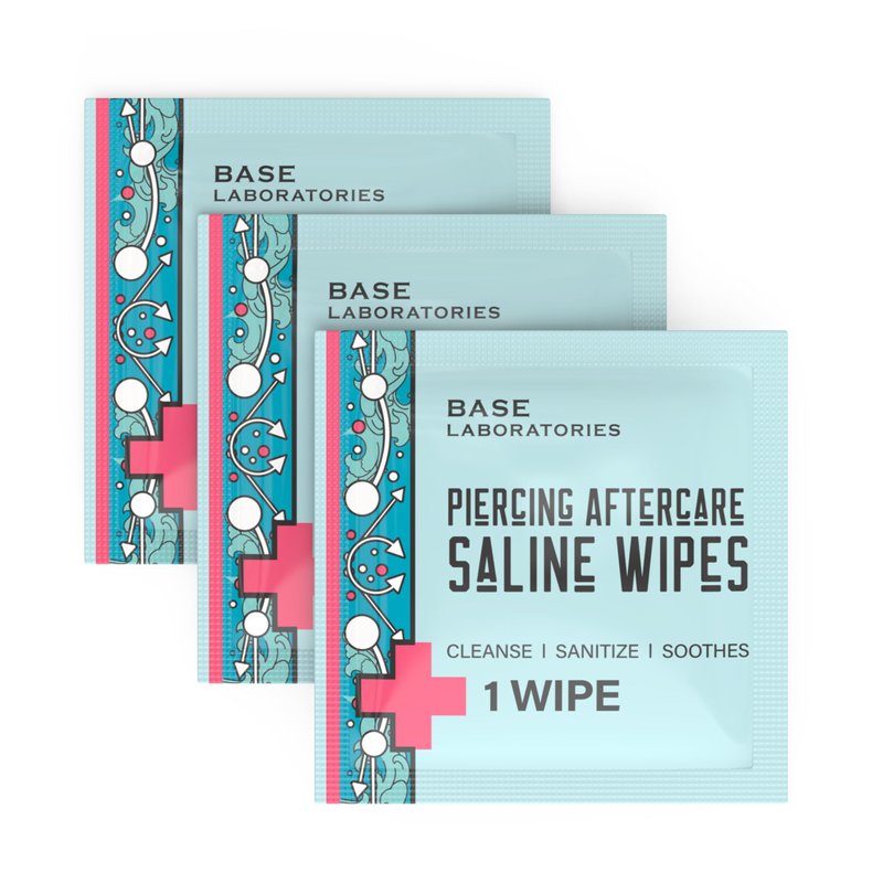 Base Labs Piercing Aftercare Wipes - CLEANSE - STERILIZE - SOOTHE Features 75 individually wrapped wipes, pre-moistened in best selling saline solution for piercing. A natural topical cleanser for all body piercings and modifications, the wipes are designed to keep your new and old piercings, keloid bumps, piercing bumps, and wounds clean and infection free. Promotes fast and speedy recovery while effectively removing all impurities that cause infections and skin irritation. Powered by Sea Salt, with known healing properties for centuries. Great product to work in conjunction with our infamous Piercing Aftercare Spray Good for (bullets) Piercing Aftercare Ear Hole Cleaner Keloid Bump Removal Piercing Bumps Keloid Scars Wound Wash