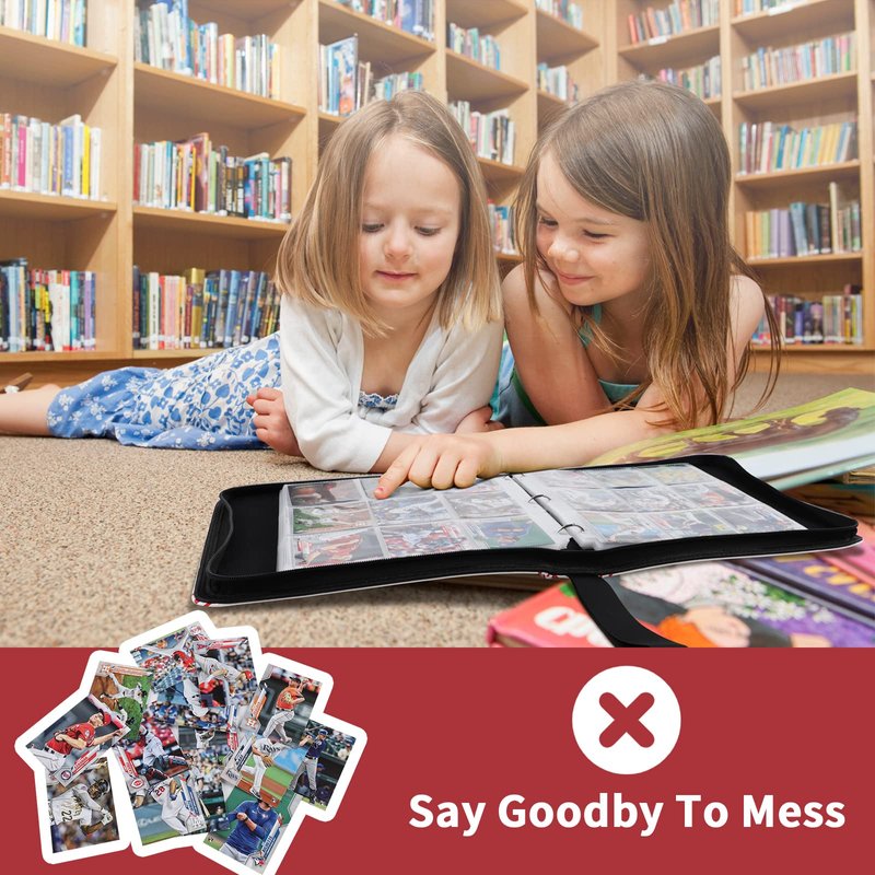 Introducing the ultimate baseball card binder, designed to meet the needs of passionate card collectors like you. Card Protection and Organization: Our binder is tailor-made for standard 2.5"x3.5" collection cards. The transparent card pages not only showcase your prized collection but also simplify classification and management, ensuring your cards stay in top-notch condition. Built to Last: Featuring a robust 3-ring binder with a durable metal spine, this binder is designed for longevity. It offers superior protection for your cherished cards, preventing wear and tear. Plus, the smooth zippers are both dustproof and water-resistant, ensuring your cards remain secure at all times. Crystal-Clear Display: Your collection deserves the best, which is why our binder utilizes acid-free, non-toxic, high-definition PP material for the card pages. Enjoy a crystal-clear, distortion-free display of your cards, preserving their value and quality. Ample Storage: With a capacity of 55 card sleeves, each capable of holding 8 baseball cards, you can store up to 440 cards efficiently. The double-sided loading option maximizes space, allowing you to expand your collection without limits. The Perfect Gift: Whether you're treating yourself or surprising a fellow collector, our binder makes for an exceptional gift. Its high-quality PU leather cover, adorned with a captivating baseball-themed pattern, adds a touch of elegance to your collection. Upgrade your card-collecting experience with our baseball card binder – a fusion of protection, organization, and style. Preserve the legacy of your cards with the best.