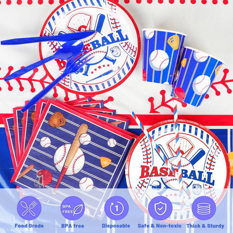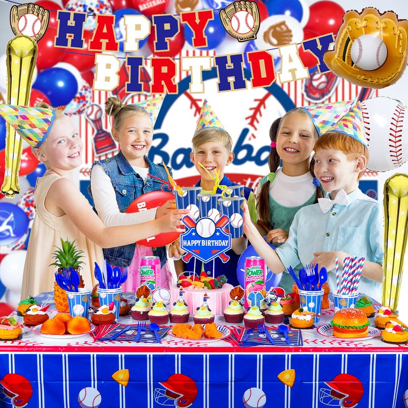 - Baseball Themed Designs: Baseball themed party decorations Featuring classic baseball colors - blue, red and white, and stylish baseball pattern designs, just this baseball birthday set makes your party fun and saves you from unnecessary hassles.