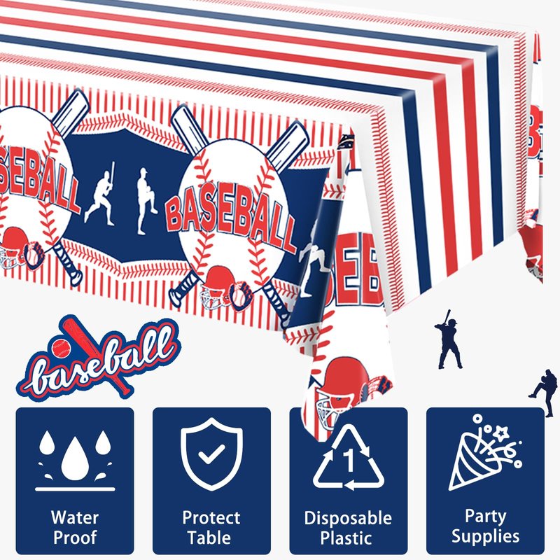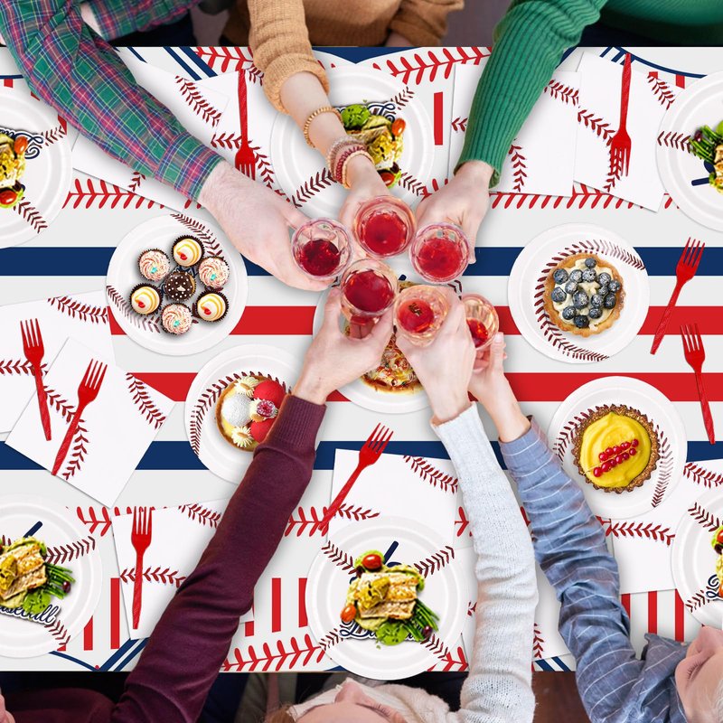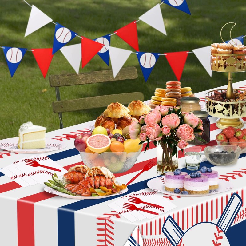 - Unique Design: Our Baseball Tableware Set are printed with classic baseball elements of blue, red and white elements and cool designs of baseballs theme pattern, The color and the pattern of the tablecloth are matched with the plates,make your baseball themed party come alive