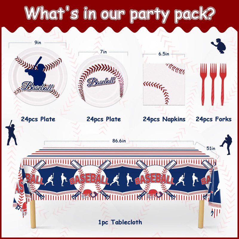 - Package Includes:You will get 97 pieces which are exquisite and lovely of baseball birthday tableware set; Package Includes 24pcs 9'' dinner plates, 24pcs 7'' dessert plates, 24pcs napkins, 24pcs forks, 1pcs baseball tablecloths, can serve for 24 guests, which can meet your needs of holding sport theme party with families and mates