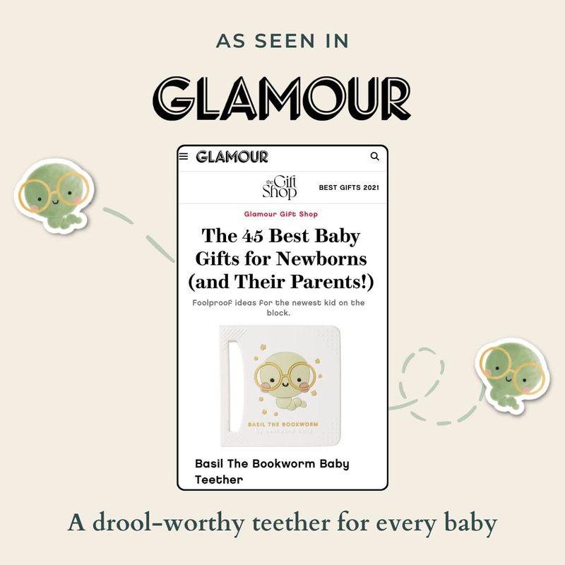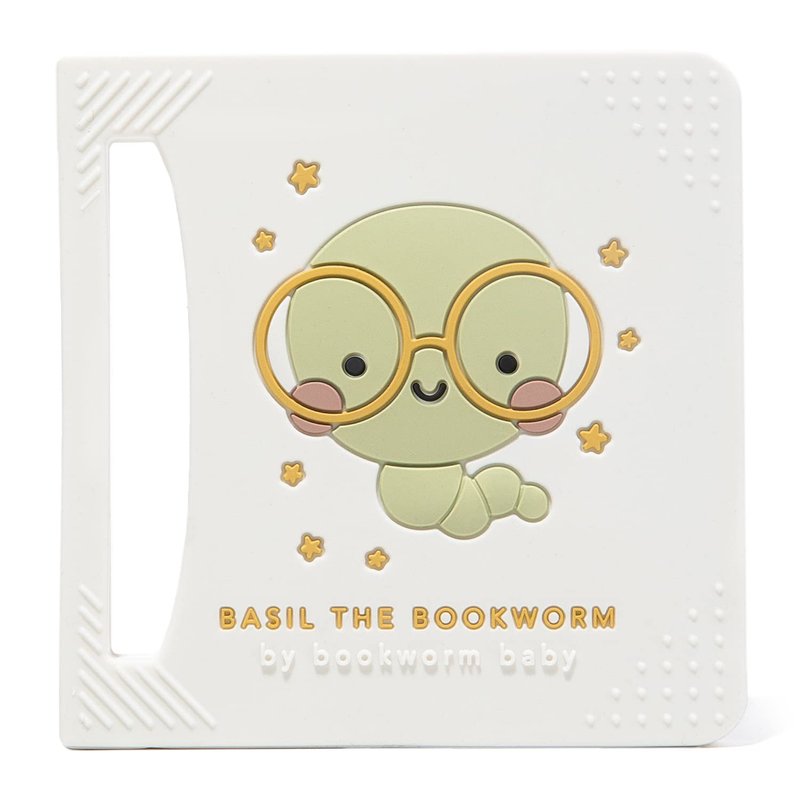 The original book-shaped premium silicone teether soothes irritated gums & imitates baby's favorite books for an easy, intuitive hold. Our thoughtful, patent-pending design showcases a functional and easy-to-hold handle, with engaging textures that will soothe your baby's achy gums and promote sensory development. Our lovable character, Basil the bookworm, encourages the love of books at an early age.