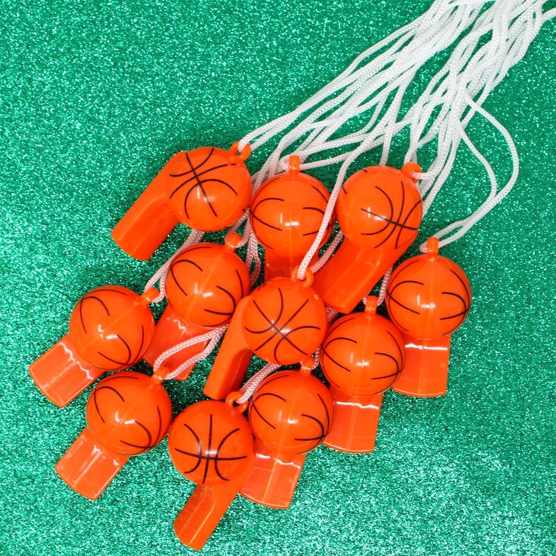 Elevate the spirit of the game with our Basketball Whistles with Lanyard! This pack of 12 basketball-themed whistles is the ultimate party favor for any basketball enthusiast. Whether you're celebrating a basketball-themed birthday party, hosting a team victory celebration, or organizing a sporty gathering, these whistles are a must-have. Designed to unleash team spirit and create an atmosphere of excitement, these whistles are perfect for cheering on your favorite players or adding a thrilling element to any basketball game. Made from durable plastic, they are built to withstand the enthusiastic blows of even the most ardent fans. Each whistle comes with a nylon string lanyard, ensuring convenience and easy access during the game. These whistles offer endless possibilities beyond the basketball court. Use them as fun treats for goody bags, liven up group events, or add a playful touch to sports-themed parties. Let your imagination run wild as you explore the multitude of ways to incorporate these whistles into your festivities. Looking to make your end-of-season party extra special? Use these whistles as door prizes, allowing the winners to blow the final whistle of the season. It's a memorable way to commemorate their contribution to the team's success and create lasting souvenirs. Don't miss out on the fun! Get your hands on these Basketball Whistles with Lanyard today and experience the joy and excitement they bring to every basketball event. Elevate your celebration, create unforgettable memories, and let the games begin!