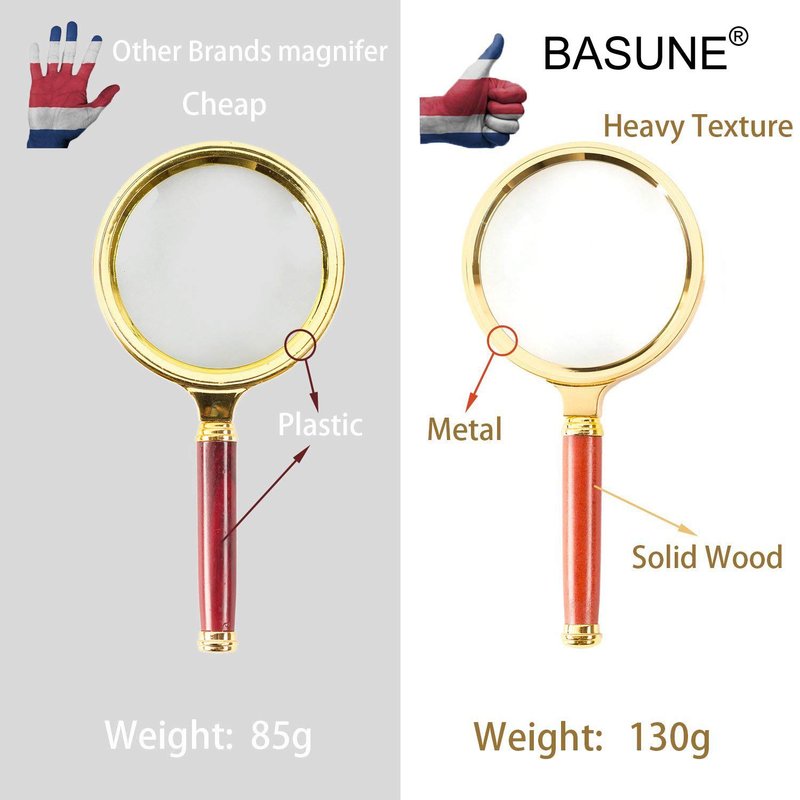 BASUNE 10X Handheld Magnifier, Reading Magnifier Loupe Glasses 10X with Rosewood Handle for Book and Newspaper Reading, Insect and Hobby Observation, Classroom Science (Metal Frame)