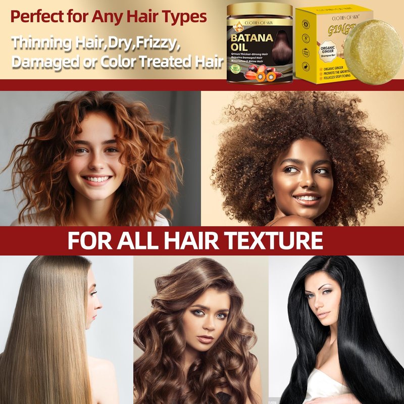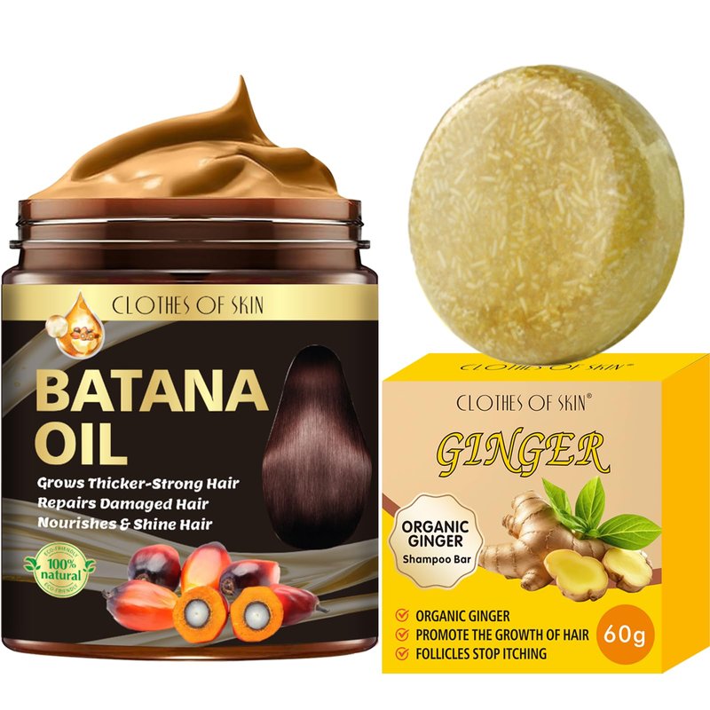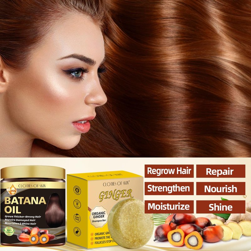 - 𝐁𝐚𝐭𝐚𝐧𝐚 𝐎𝐢𝐥 𝐅𝐨𝐫 𝐇𝐚𝐢𝐫 𝐆𝐫𝐨𝐰𝐭𝐡 & 𝟐 𝐏𝐚𝐜𝐤 𝐆𝐢𝐧𝐠𝐞𝐫 𝐑𝐞𝐠𝐫𝐨𝐰𝐭𝐡 𝐇𝐚𝐢𝐫 𝐒𝐡𝐚𝐦𝐩𝐨𝐨 𝐁𝐚𝐫: Raw Batana Oil is a natural hair care oil that helps promote hair regrowth, repair damaged hair and prevent hair loss. This unrefined oil is packed with Vitamin E, providing your hair with natural nourishment