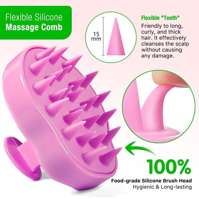 - HAIR AND SCALP SILICONE MASSAGE COMB:This hairbrush is equipped with comb teeth that are cleverly arranged in a high and low position to mimic the gentle force of fingers when combing the hair. It also boasts an ergonomically designed handle, ensuring easy and effortless grip even when wet. Made of flexible, soft silicone, 100% food grade and suitable for all hair types