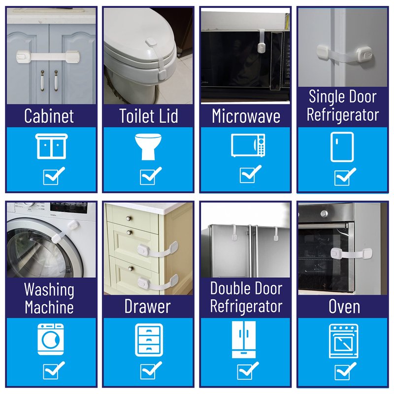- Ensure your baby or toddler is safe by securing cabinets, appliances, drawers, refrigerator, trash bin, toilet seat, and more. With these child locks, you can keep your stuff neatly organized as your curious child cannot reach them.