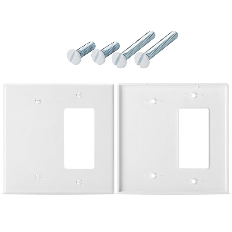 - Package includes 1 pc of 2-gang 1-blank wall plate and 4 matching screws. The white finish on these wall plates is perfect for use in the home or office environments and will match any color of wall!