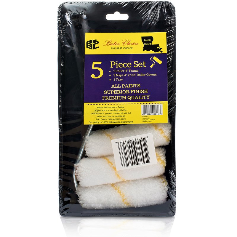Bates Choice 4” Tray Set Is Designed For Home Owners, Professional Painters To Complete A Well Done Painting Job. This Paint Roller Tray Set Includes 5pc: 3 Paint Roller Covers: 4 Inch Roller Naps Shed-Resistant Micro-Fiber Material ½ Inch Thickness 1 Roller Frame: Sturdy 4-Inch Roller Frame 1 Paint Tray: PP Plastic Material Mini Paint Roller Tray