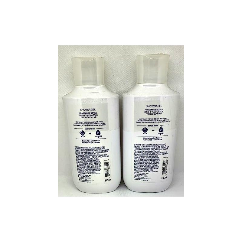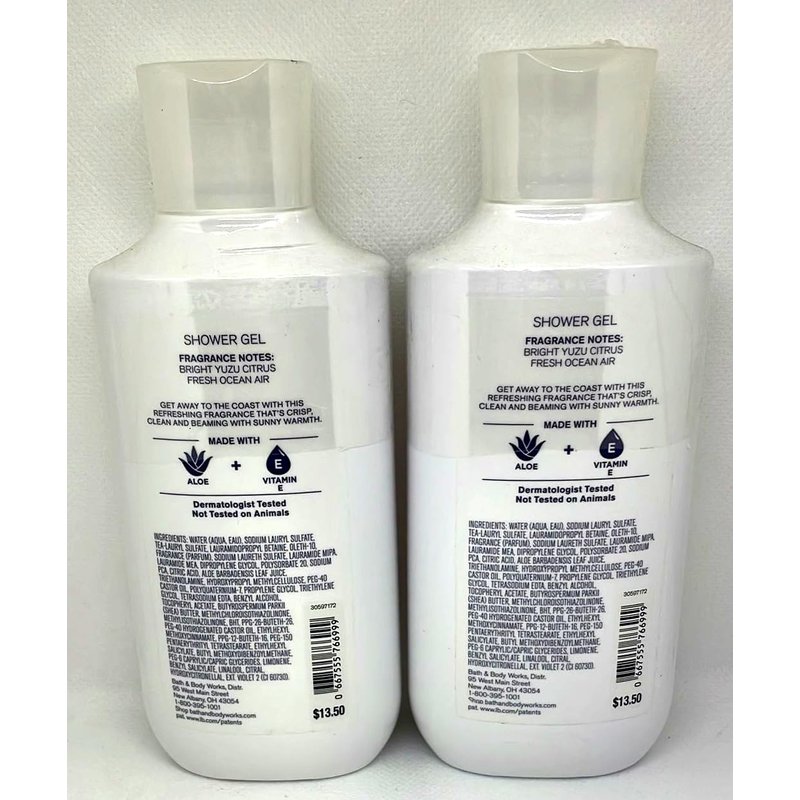 Bath and Body Works Fresh Getaway Shower Gel Gift Set. Fragrance: Bright yuzu citrus and fresh ocean air. Set Includes: 2 Shower Gels (10 oz each). Infused with shea and cocoa butter and coconut oil, it's clinically tested to moisturize after just one shower. A rich and creamy lather gently cleanses and instantly hydrates skin.