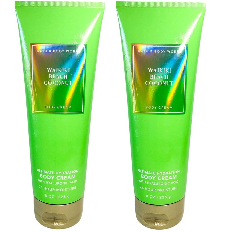 Bath & Body Works (2 pack) Waikiki Beach CoconutUltimate Hydration Body Cream 8 Oz.... What it does: leaves your skin feeling soft, smooth and replenished, just like your favorite body cream—but with hyaluronic acid. Why you'll love it: Infused with the good stuff (vitamin E, aloe, shea and cocoa butters and hyaluronic acid), 24-hour moisture, Rich, luxe texture, Made without parabens or artificial dyes, Dermatologist tested, Bottle made with 82% recycled plastic.... What it smells like: a sweet, sunny beach vacay. Fragrance notes: tropical white coconut, saltwater breezes and sun-bleached woods. (Packaging may vary)