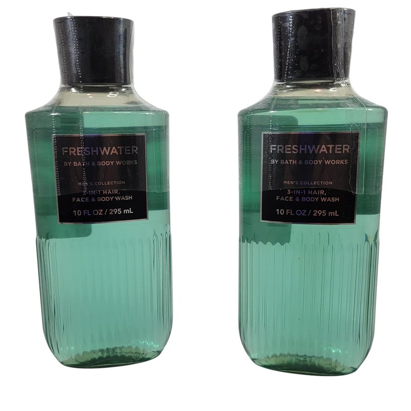 Bath & Body Works Freshwater (2 Pack) Shower Gel 10 Oz.. What it smells like: a cool, rejuvenating lake swim in the Alps. Fragrance notes: Italian bergamot, mountain spring water and oak moss.. What it does: leaves your skin feeling soft, smooth and replenished, just like your favorite body cream—but with hyaluronic acid. Why you'll love it: Infused with the good stuff (vitamin E, aloe, shea and cocoa butters and hyaluronic acid), 24-hour moisture, Rich, luxe texture, Made without parabens or artificial dyes, Dermatologist tested, Bottle made with 82% recycled plastic. (Packaging may vary)