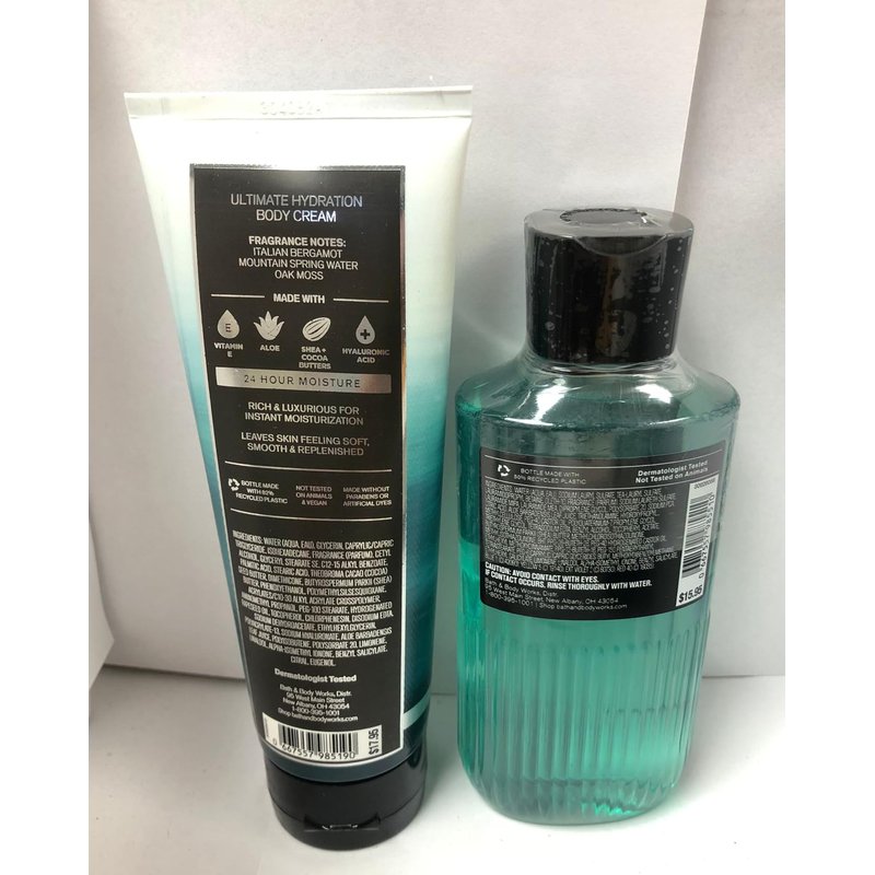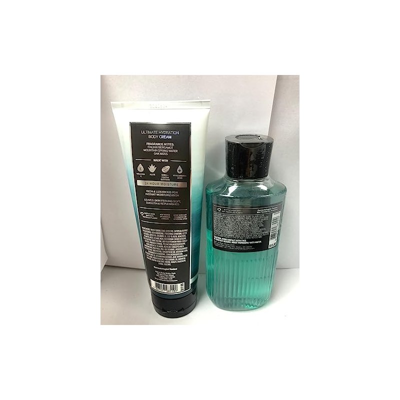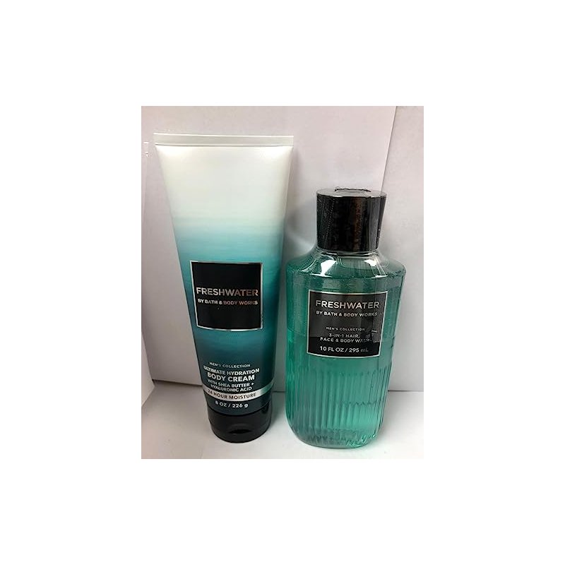 Bath & Body Works Freshwater (2 Pack) Ultimate Hydration Body Cream 8 Oz .& Shower Gel 10 Oz... What it smells like: a cool, rejuvenating lake swim in the Alps. Fragrance notes: Italian bergamot, mountain spring water and oak moss.. What it does: leaves your skin feeling soft, smooth and replenished, just like your favorite body cream—but with hyaluronic acid. Why you'll love it: Infused with the good stuff (vitamin E, aloe, shea and cocoa butters and hyaluronic acid), 24-hour moisture, Rich, luxe texture, Made without parabens or artificial dyes, Dermatologist tested, Bottle made with 82% recycled plastic. (Packaging may vary)