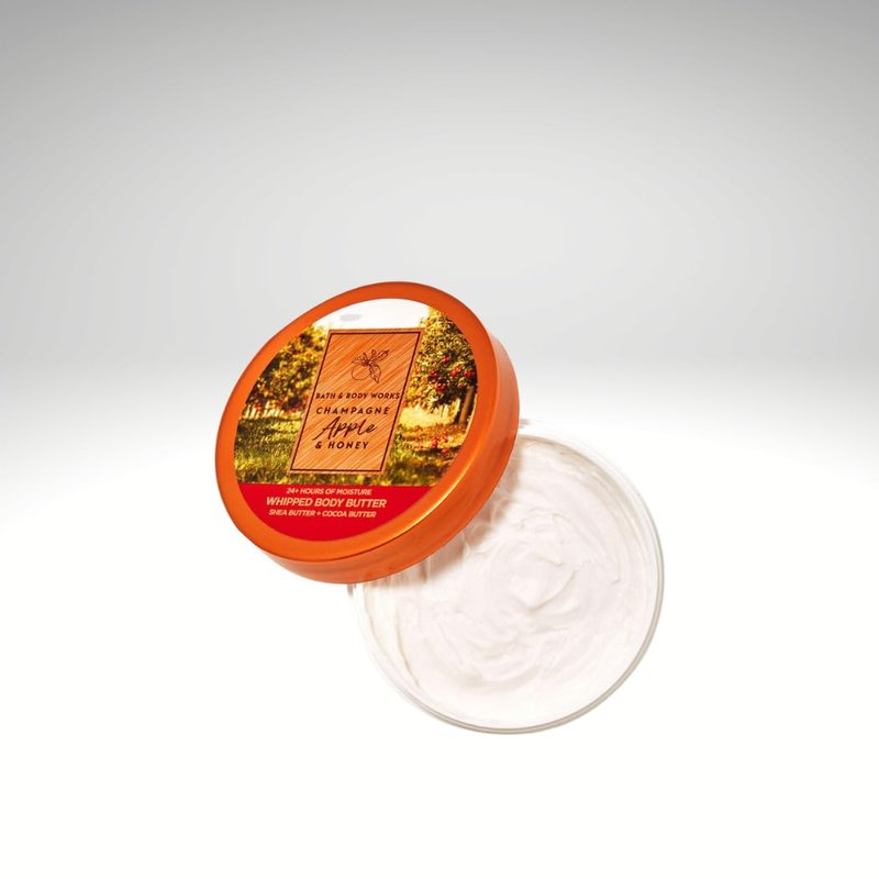 Bath & Body Champagne Apple & Honey whipped body butter. What it smells like: sipping bubbly drinks in the apple orchard. Fragrance notes: crisp apple, sparkling champagne, jasmine honey, and autumn woods. What it does: provides over 24 hours of intense moisture. Infused with the good stuff (shea butter and cocoa butter). Why you'll love it: Infused with the good stuff (shea butter and cocoa butter) Whipped, fluffy texture absorbs quickly. Dermatologist tested