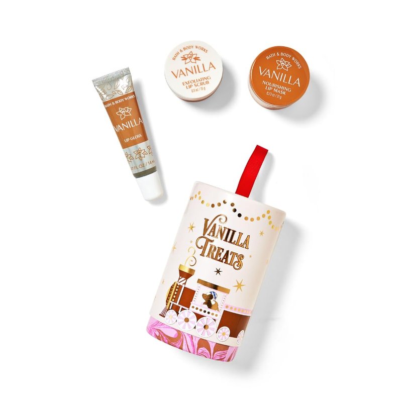 Bath & Body Vanilla Treats - Mini Gift Set - 3 step lip routine with Exfoliating Lip Scrub, Nourishing Lip Mask, and Lip Gloss with Decorative Gift Box. What it does: makes gifting so easy and puts a smile on their face. Tastes like a creamy, dreamy treat. Includes Vanilla Lip Gloss, Vanilla Lip Scrub and Vanilla Lip Mask. Box measures 4.75"H x 2.5" W.