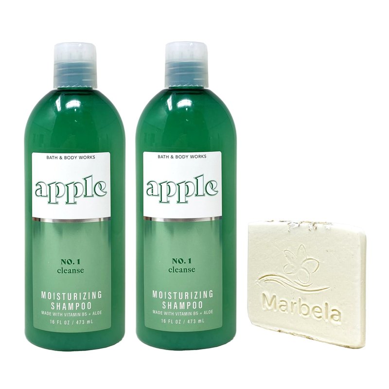 Bath & Body Works Apple Moisturizing Shampoo Gift Set with a Marbela Natural Oats Sample Soap. INCLUDES: 2 Moisturizing Shampoos (16 fl oz / 473 mL each) and a Marbela Natural Oats Sample Soap (Soap May Vary). Apple - What it smells like: a bright and light fruity delight. Fragrance notes: apple, strawberry and rain. What it does: gently cleanses and hydrates to restore softness and shine. Marbela Sample Soap - While ordinary soaps dry out your skin, Marbela specializes in all-natural, moisturizing soaps and bath products that will take your self-care routine to the next level. The priority is to create products that are all-natural, vegan, cruelty-free and most importantly, handmade with love.