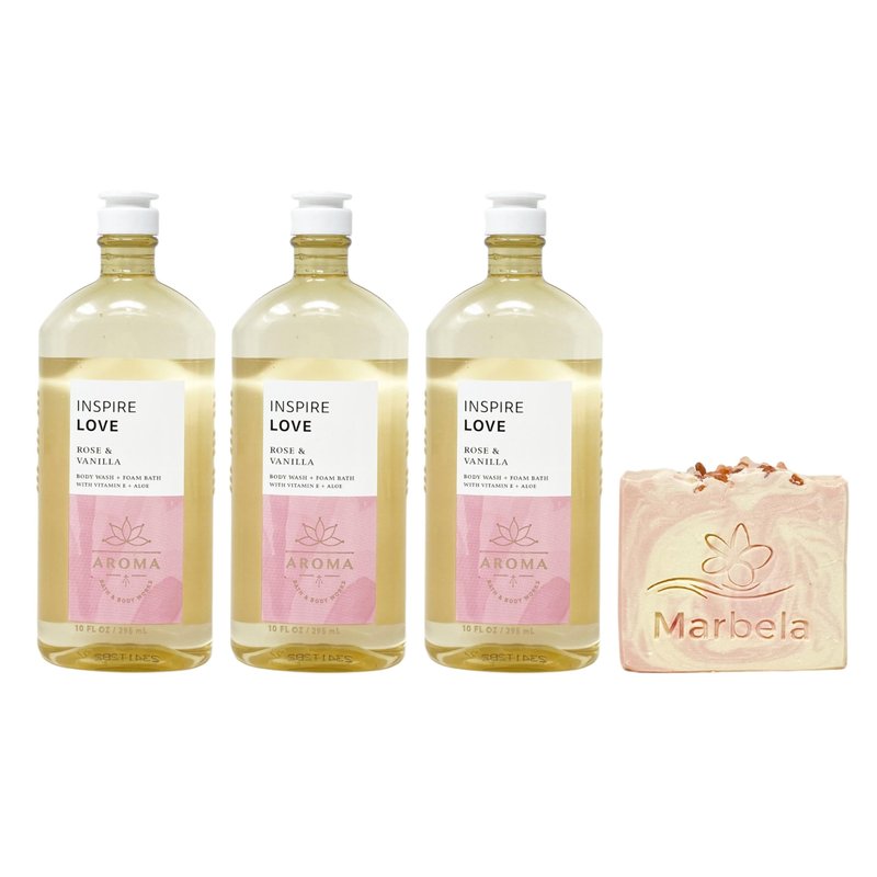 Bath & Body Works Aroma Inspire Love ROSE + VANILLA Body Wash + Foam Bath Set with a Marbela Himalayan Salts Springs Bar Soap. INCLUDES: 3 Body Wash + Foam Baths (10 fl oz / 295 mL each) and a 4 oz Marbela Himalayan Salts Springs Bar Soap. Rose + Vanilla - What it smells like: a sweet, smooth floral created to inspire all the love. Fragrance notes: rose essential oil and vanilla absolute. Marbela Himalayan Salts Springs Soap - Himalayan salts help hydrate and nourish the skin, with its water absorbent properties. These minerals are known to be helpful for acne, irritated and dry skin. Himalayan Salt Springs soap has natural kaolin clay blended to further moisturize and hydrate your body. Scent: Citrusy Florals with Litsea Cubeba Essential Oil.