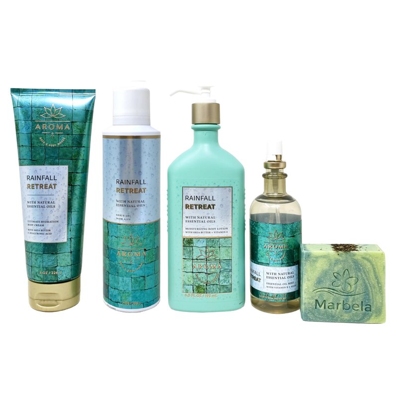 Bath & Body Works Aroma Rainfall Retreat Deluxe Set with a Marbela Fresh Forest Bar Soap. INCLUDES: 8 oz / 226 g Ultimate Hydration Body Cream, 6.5 fl oz / 1992 mL Moisturizing Body Lotion, 7 oz / 198 g Shave Gel, 5.3 fl oz / 156 mL Essential Oil Mist, and a 4 oz Marbela Fresh Forest Bar Soap. Rainfall Retreat - What it smells like: a steamy and soothing spa treatment. Fragrance notes: fresh eucalyptus, warm cedarwood and dewy cucumber. Marbela Fresh Forest Soap - Fresh Forest is recommended for irritated, oily skin, including acne prone skin because of the properties of its ingredients. The rosemary, sandalwood and mint are all natural ingredients that help you feel like the cleanest version of you. For example, mint is nature’s humectant helping skin stay nourished and hydrated while rosemary essential oil is a natural astringent, hydrating and controlling oil production of the skin. Scent: Sandalwood, Mint, and Rosemary Essential Oil.