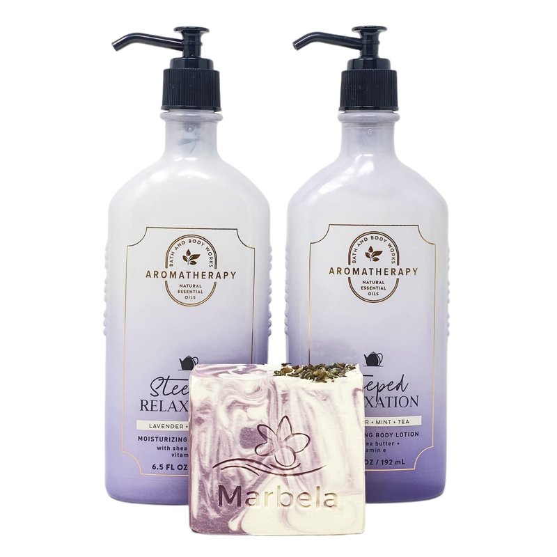 - Bath & Body Works Aromatherapy Steeped Relaxation Lavender + Mint + Tea 2 Pack Moisturizing Body Lotion Gift Set with a Lavender Dream Bar Soap - Full Size