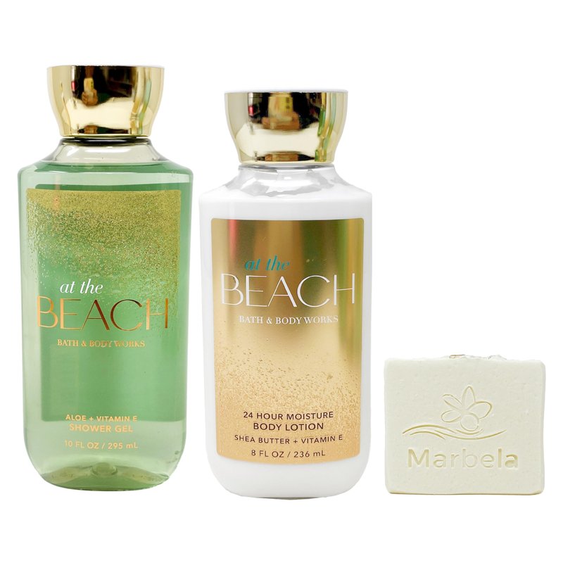 - Bath & Body Works At the Beach with a Marbela Natural Oats Sample Soap. (Marbela Sample Soap May Very)