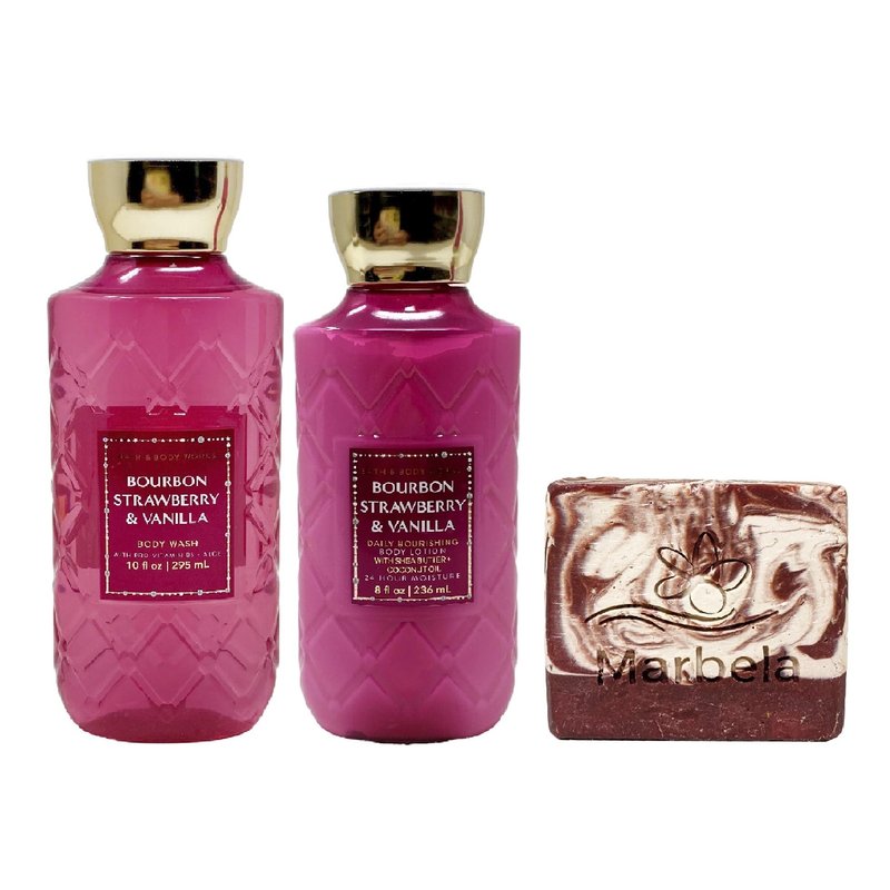 Bath & Body Works Bourbon Strawberry & Vanilla Duo Gift Set with a Marbela Cherry On Top Bar Soap. INCLUDES: 10 fl oz / 295 mL Body Wash, 8 fl oz / 236 mL Daily Nourishing Body Lotion, and a 4 oz Marbela Cherry On Top Bar Soap. Bourbon Strawberry & Vanilla - What it smells like: a sweet yet exciting adventure. Fragrance notes: bourbon vanilla, garden strawberry and apricot nectar. Marbela Cherry On Top Bar Soap - Grab a bowl, throw some bananas in the bottom with scoops of your favorite ice cream on top. Drizzle your ice cream with chocolate and caramel sauce and finally save the very best two ingredients for last. Whip cream dollops on top of the ice cream tower and add the cherries right on top. Scent: Cherry, Vanilla, Strawberry.