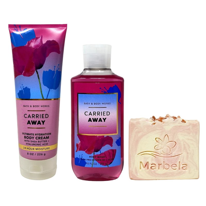 Bath & Body Works Carried Away 2 Piece Gift Set with a Marbela Himalayan Salts Springs Bar Soap. INCLUDES: 8 oz / 226 g Ultimate Hydration Body Cream, 10 fl oz / 295 mL Body Wash, and a 4 oz Marbela Himalayan Salts Springs Bar Soap. Carried Away - What it smells like: getting swept off your feet by your true love. Fragrance notes: lush raspberries, juicy pear nectar, white jasmine and whipped vanilla. Marbela Himalayan Salts Springs Bar Soap - Himalayan salts help hydrate and nourish the skin, with its water absorbent properties. These minerals are known to be helpful for acne, irritated and dry skin. Himalayan Salt Springs soap has natural kaolin clay blended to further moisturize and hydrate your body. Scent: Citrusy Florals with Litsea Cubeba Essential Oil.