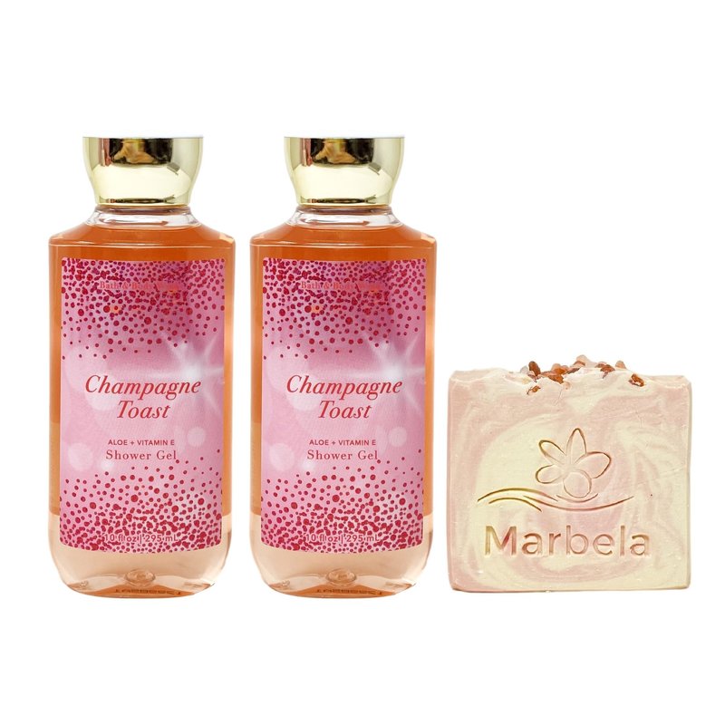 • Bath & Body Works Champagne Toast Shower Gel Value Pack with a Marbela Himalayan Salts Springs Bar Soap.