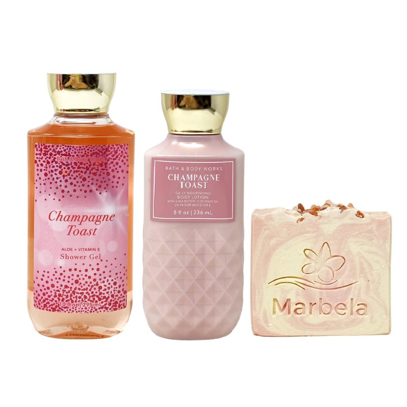 Bath & Body Works Champagne Toast Duo Gift Set with a Marbela Himalayan Salts Springs Bar Soap. INCLUDES: 10 fl oz / 295 mL Shower Gel, 8 fl oz / 236 mL Daily Nourishing Body Lotion, and a 4 oz Marbela Himalayan Salts Springs Bar Soap. Champagne Toast - What it smells like: a fruity, sweet, sparkling spritzer. Fragrance notes: bubbly champagne, sparkling berries and juicy tangerine. Marbela Himalayan Salts Springs Soap - Himalayan salts help hydrate and nourish the skin, with its water absorbent properties. These minerals are known to be helpful for acne, irritated and dry skin. Himalayan Salt Springs soap has natural kaolin clay blended to further moisturize and hydrate your body. Scent: Citrusy Florals with Litsea Cubeba Essential Oil.