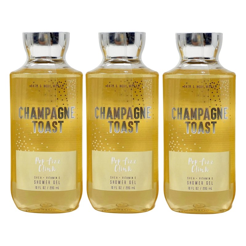 Bath & Body Works Champagne Toast 3 Shower Gel (10 FL Oz / 295 ml each) Bubbly, fragrant lather skin feels irresistibly soft and clean, Shea butter + vitamin E Fragrance Notes: Pink champagne, black currant chambord, sparkling nectarine and sugared musk.