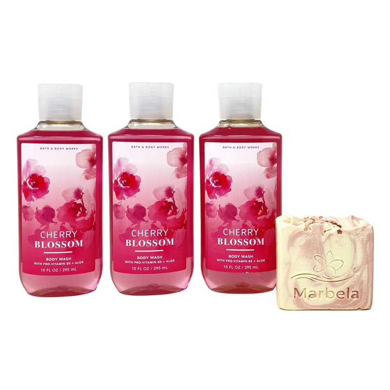Bath & Body Works Cherry Blossom Body Wash Bundle with a Marbela Himalayan Salts Springs Bar Soap. INCLUDES: 3 Body Washes (10 fl oz / 295 mL each) and a 4 oz Marbela Himalayan Salts Springs Bar Soap. Cherry Blossom - Fragrance Notes: Dewy Watermelon, Red Plum, Cherry Blossom, Sheer Freesia, Soft Sandalwood. Marbela Himalayan Salts Springs Soap - Himalayan salts help hydrate and nourish the skin, with its water absorbent properties. These minerals are known to be helpful for acne, irritated and dry skin. Himalayan Salt Springs soap has natural kaolin clay blended to further moisturize and hydrate your body. Scent: Citrusy Florals with Litsea Cubeba Essential Oil.