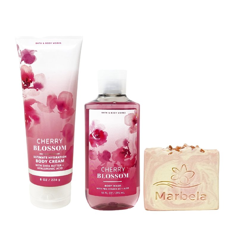 Bath & Body Works Cherry Blossom 2 Piece Bundle with a Marbela Himalayan Salts Springs Bar Soap. INCLUDES: 8 oz / 226 g Ultimate Hydration Body Cream, 10 fl oz / 295 mL Body Wash, and a 4 oz Marbela Himalayan Salts Springs Bar Soap. Cherry Blossom - Fragrance Notes: Dewy Watermelon, Red Plum, Cherry Blossom, Sheer Freesia, Soft Sandalwood. Marbela Himalayan Salts Springs Soap - Himalayan salts help hydrate and nourish the skin, with its water absorbent properties. These minerals are known to be helpful for acne, irritated and dry skin. Himalayan Salt Springs soap has natural kaolin clay blended to further moisturize and hydrate your body. Scent: Citrusy Florals with Litsea Cubeba Essential Oil.