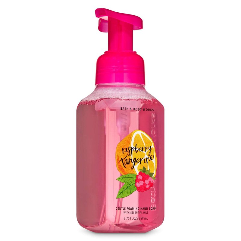 Bath and Body Works Raspberry Tangerine Gentle Foaming Hand Soap is a sweet, bright blend of wild raspberries, fresh tangerine, and lemon zest. Buyers receive a bottle of hand soap with foam pump included. 8.75 ounces.