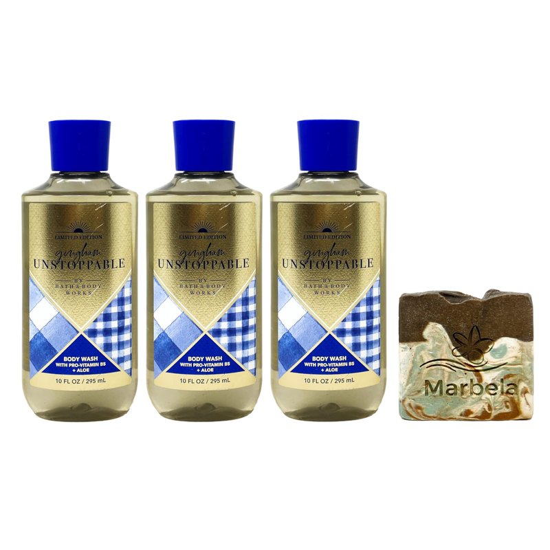 Bath & Body Works Gingham Unstoppable Body Wash Bundle with a Marbela Cabin Spice Bar Soap. INCLUDES: 3 Body Washes (10 fl oz / 295 mL each) and a 4 oz Marbela Cabin Spice Bar Soap. Gingham Unstoppable - What it smells like: confidently navigating anything the day throws your way. Fragrance notes: fresh neroli, sparkling water, and clean musk. Marbela Cabin Spice Bar Soap - Imagine being cozied up next to a bonfire, cooking over the fire, and smelling the smoke all through the air. There are few things that feel quite like fall in the same way a bonfire does. Cabin Spice is the perfect warm scent to last from early fall all the way through the winter. Notes of: Tobacco, Patchouli, Bay Mad.