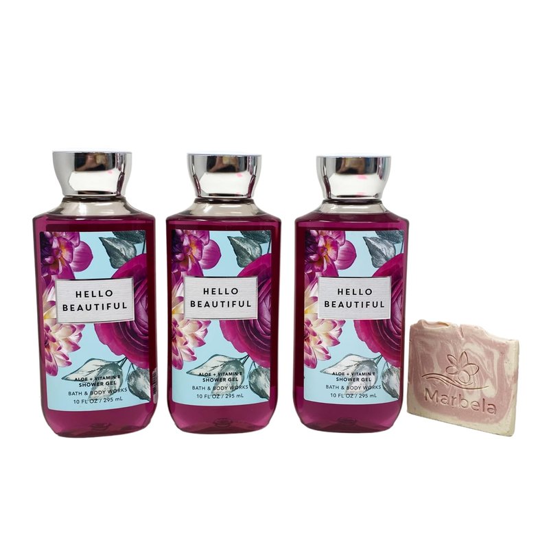 Bath & Body Works Hello Beautiful Aloe + Vitamin E Shower Gel 3 Piece Bundle. INCLUDES: 3 Aloe + Vitamin E Shower Gels (10 fl oz / 295 mL each) with a Marbela Sample Soap (Marbela soap may very). Hello Beautiful - Fragrance notes: White Gardenia, Jasmine Petals, Magnolia Blossom, Pink Nectarine, Cotton Musk. What it does: leaves your skin feeling fresh, clean and beautifully fragranced. Infused with the good stuff (vitamin E and aloe). Light, bubbly lather. Gentle cleanser (a.k.a. daily indulgence). Marbela Sample Soap - While ordinary soaps dry out your skin, Marbela specializes in all-natural, moisturizing soaps that will take your self-care routine to the next level. The priority is to create products that are all-natural, vegan, cruelty-free and most importantly, handmade with love.
