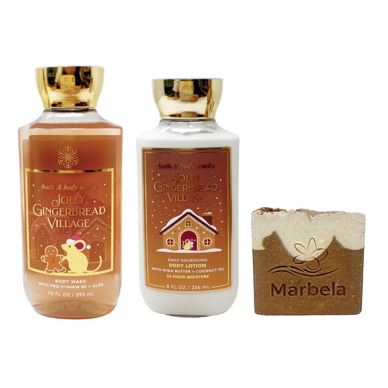 Bath & Body Works Jolly Gingerbread Village - Duo Gift Set - Body Wash and Body Lotion with a Yamma Jamma Bar Soap, Full Size, brown